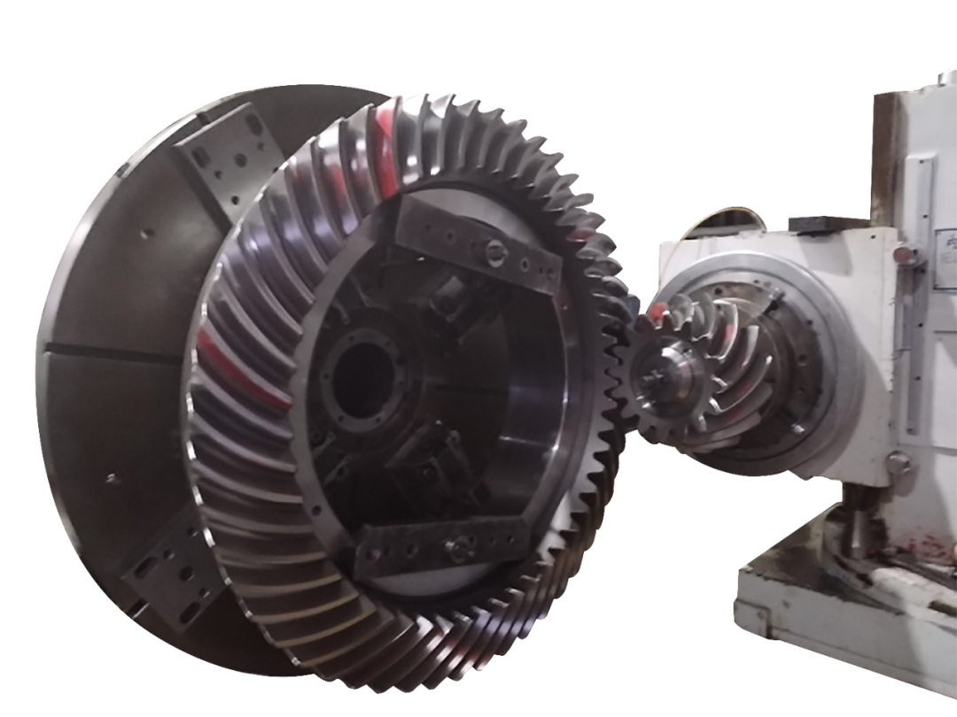 該大齒輪旋轉中心線沿靜止中心線以半徑R1.2做圓周運動,齒形設計要保證大齒輪不動時能軸向抽出小齒輪,以便檢修,大輪為薄壁件,熱處理易變形,滾檢要求特殊:需同時滿足前后上下共計調整8個點著色要求。該產品的成功研制,代表著我司錐齒輪設計與加工技術邁上了更高的臺階。